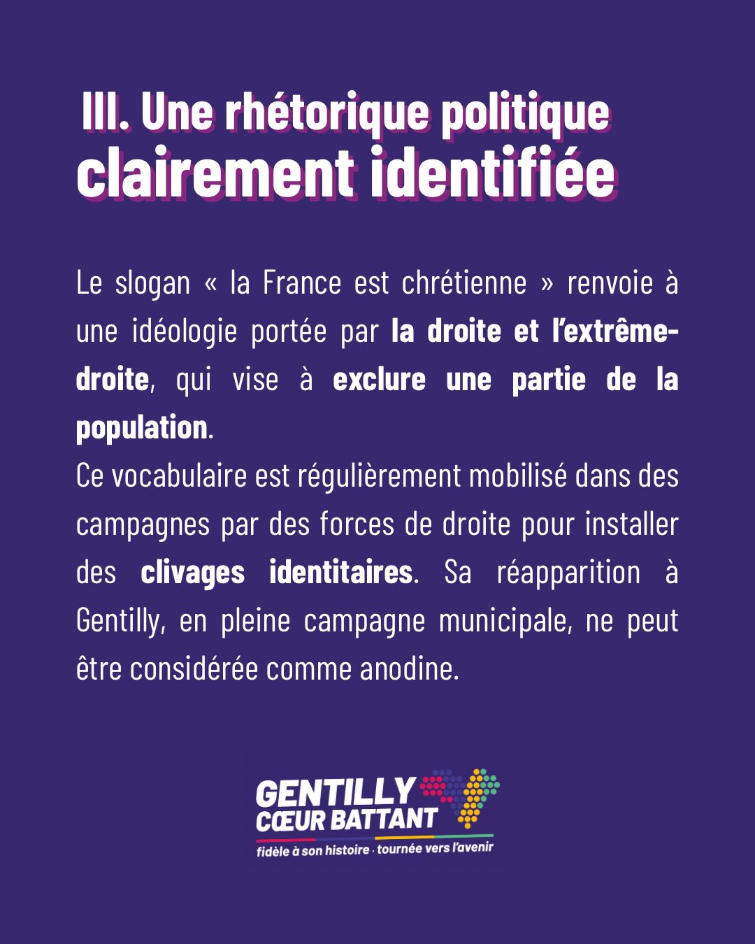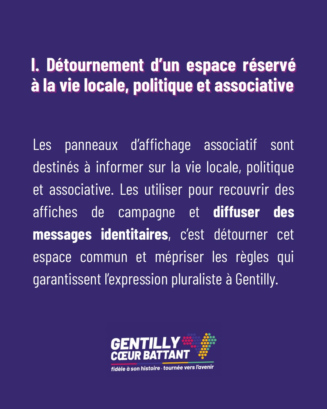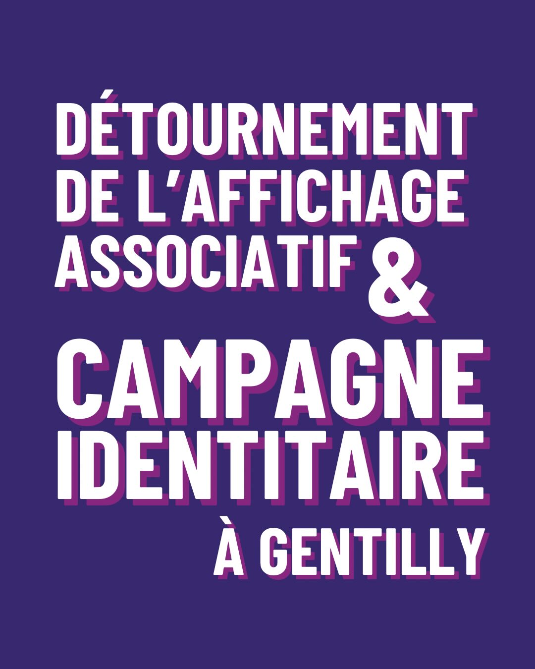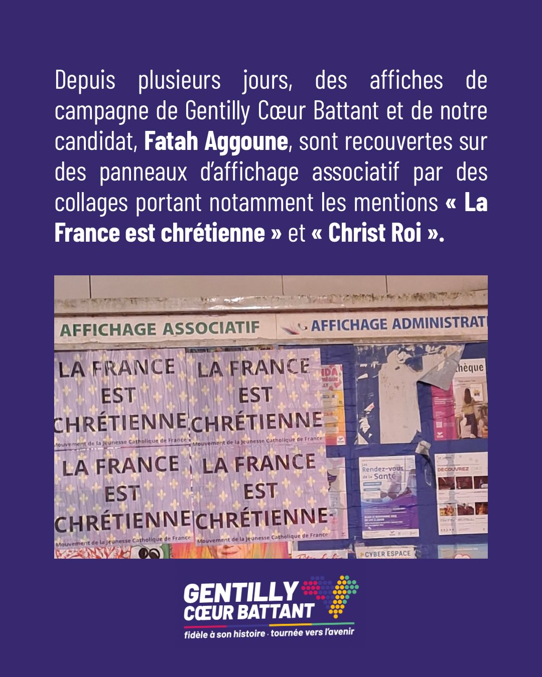 DÉTOURNEMENT DE L'AFFICHAGE ASSOCIATIF ET CAMPAGNE IDENTITAIRE À GENTILLY À Gentilly, pas de place pour les slogans de la droite extrême et de l’extrême droite !Nous défendons une campagne respectueuse, fidèle à la laïcité, au vivre-ensemble et au débat démocratique.